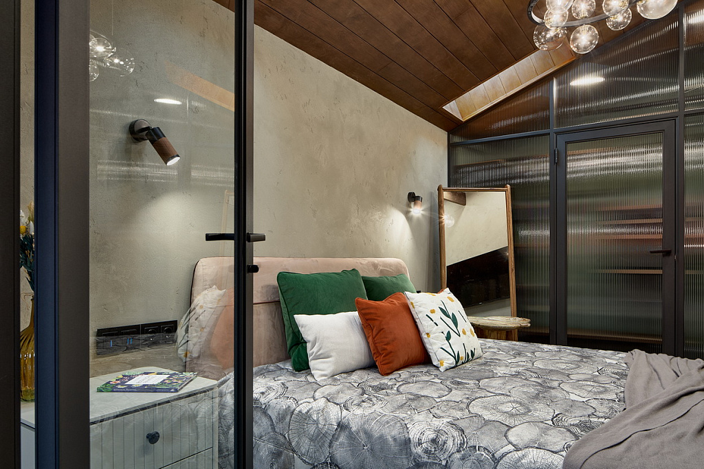 Комнату площадью менее 20 м<sup>2</sup> разделили на три части. Это позволило сделать жизнь героев «Дачного ответа» максимально комфортной, поскольку их спальня превратилась в настоящую квартиру-студию, отдельную от остального дома. Прежде всего, в ней появилась кровать шириной 180 см для комфортного сна.
